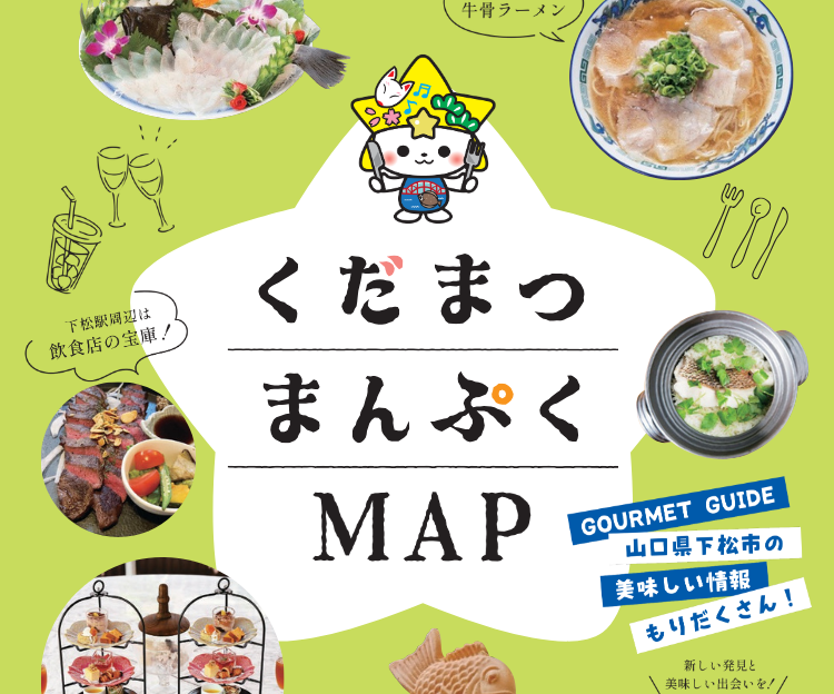 下松の飲食店情報が満載の「くだまつまんぷくMAP」!おすすめメニューや店内写真、特産品や観光スポットも掲載され、観光や日常利用に便利な見ごたえある一冊となっています。