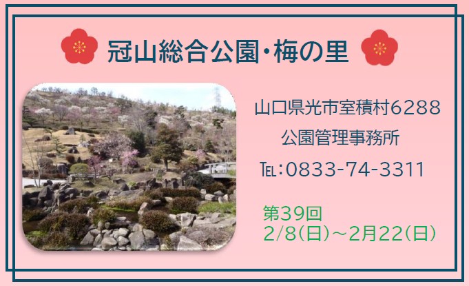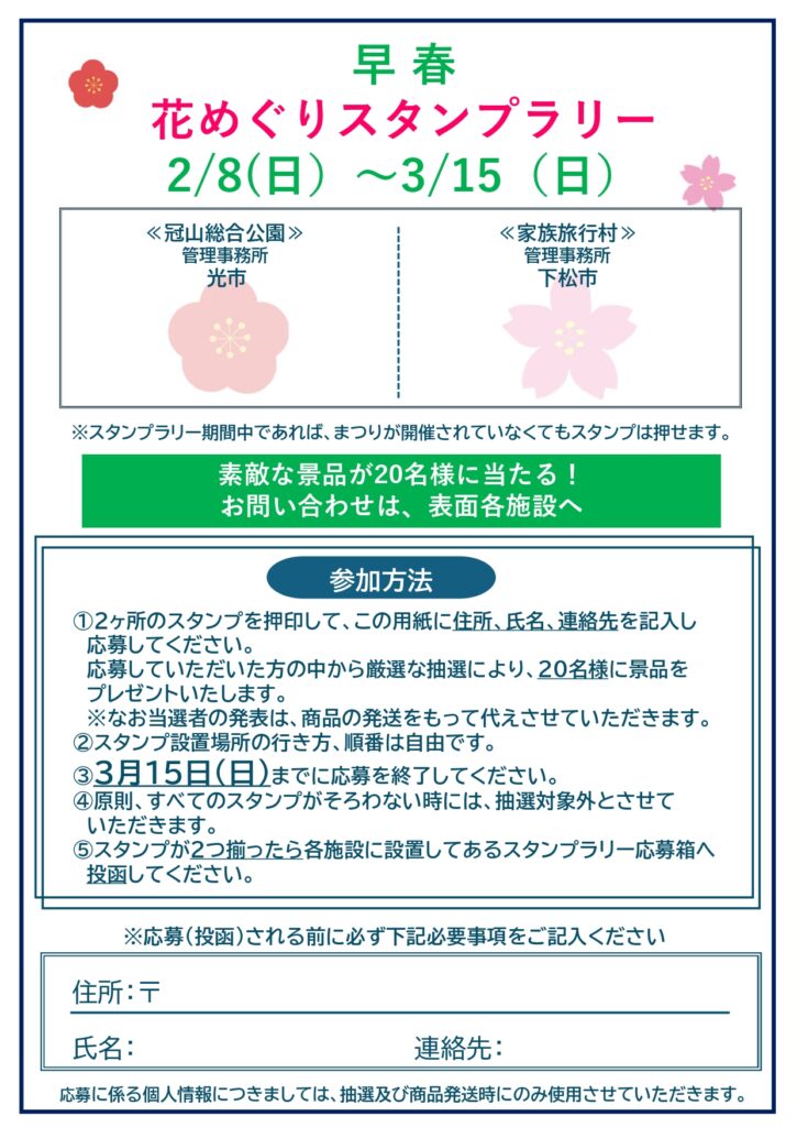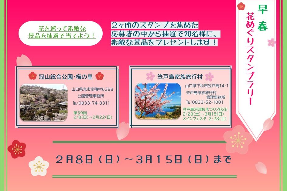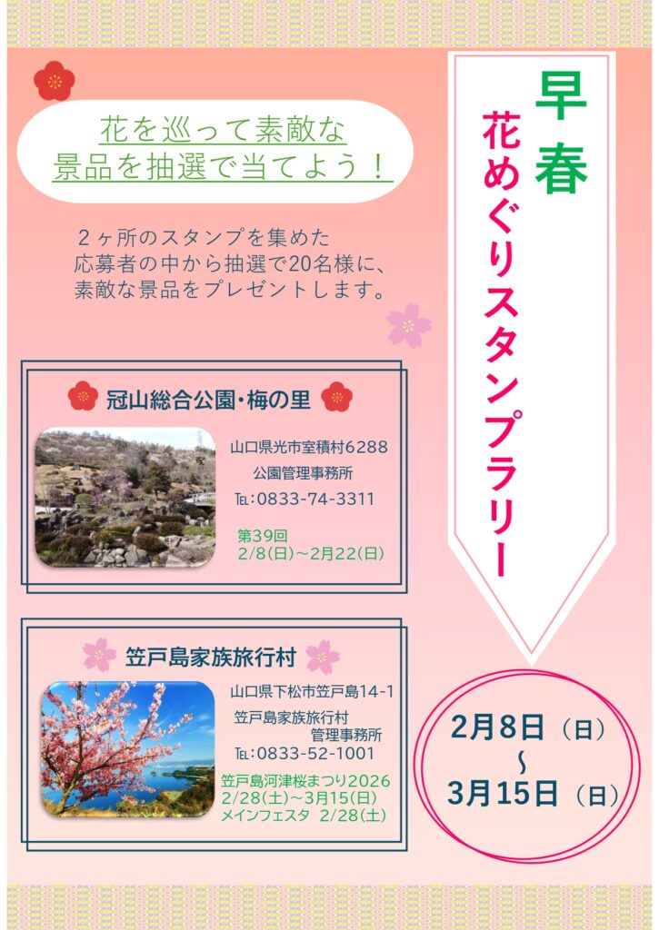 光市「冠山総合公園・梅の里」と下松市「笠戸島家族旅行村」の2ヶ所のスタンプを集めた応募者の中から抽選で20名様に素敵な景品をプレゼントします。