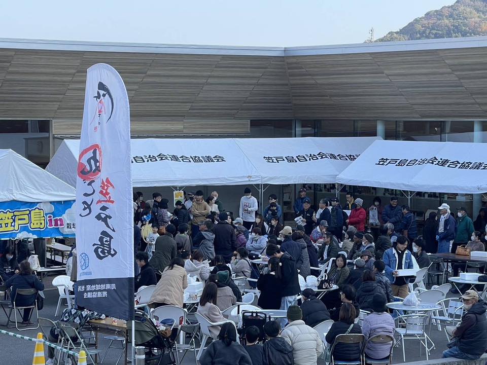 会場では飲食ブース、海鮮焼きや地元野菜の販売、また「魚をしごしちゃろう会」を中心に、漁船海難遺児のためのチャリティー募金が設置され、協力いただいた方には「笠戸のあじ」の炭火焼がふるまわれ大変好評でした!