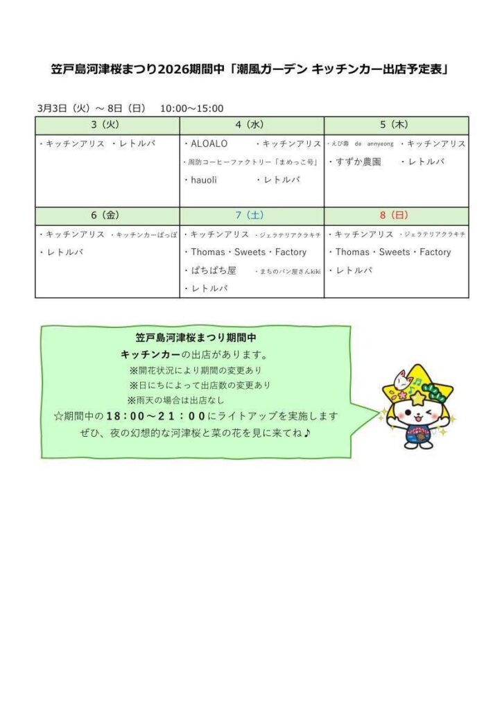 潮風ガーデン情報3.2 投稿日 2026.03.03 14:43 下松市笠戸島の「潮風ガーデン」では、3月8日(日)までキッチンカーが出店します。本日は雨の中ではありますが、3台(キッチンアリス・ぱっぽ・レトルバ)出店しました!《キッチンカー出店時間》3月8日(日)まで10:00〜15:00※天候により出店しない日もあります。