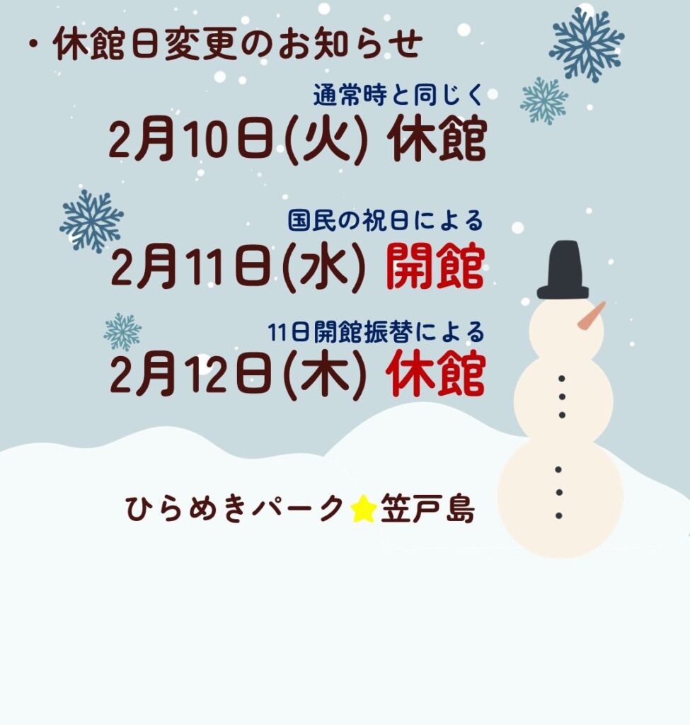 2月11日(水)は祝日ため開館、その振替で12日(木)は休館となります