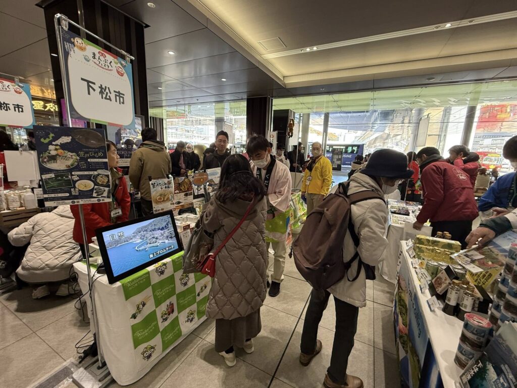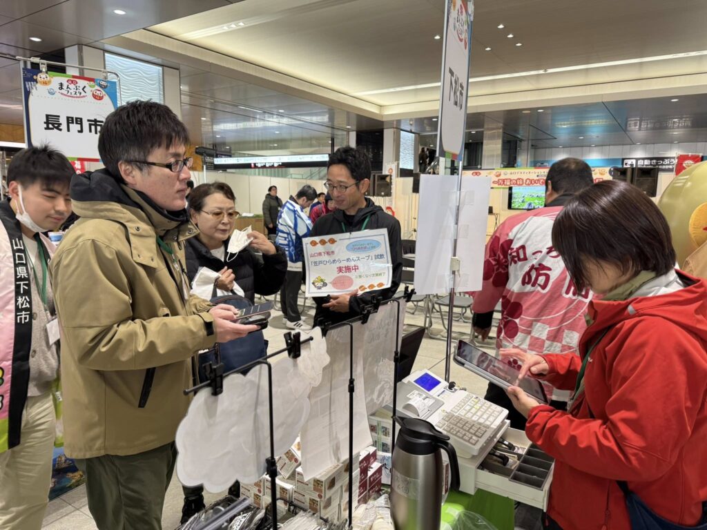 下松市ブースでは、特産品やくだまるグッズの販売、PR動画の放映、「笠戸ひらめらーめん」の試飲などを通して、下松市の魅力をしっかりとPRしました。