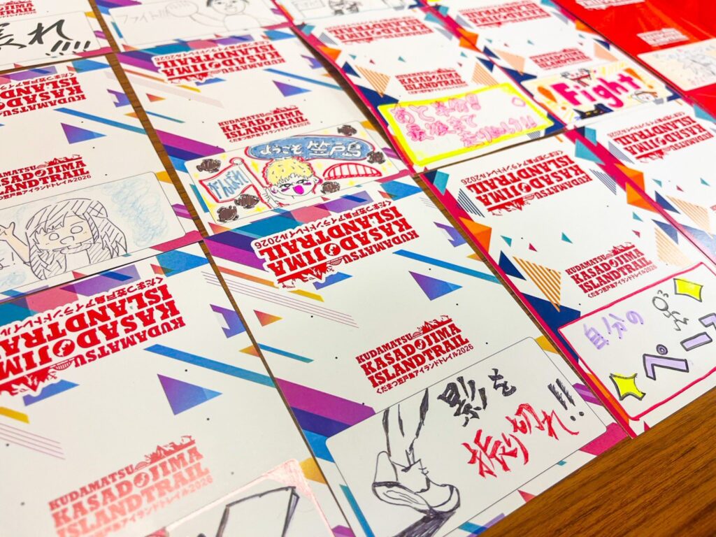 くだまつ笠戸島アイランドトレイルに向けて、エイドステーションで提供するドリンクボトルのメッセージカードを制作しました!