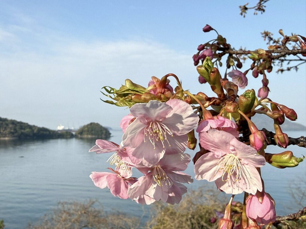 下松市笠戸島の潮風ガーデンでは、河津桜の開花が進み、3分咲きとなりました。