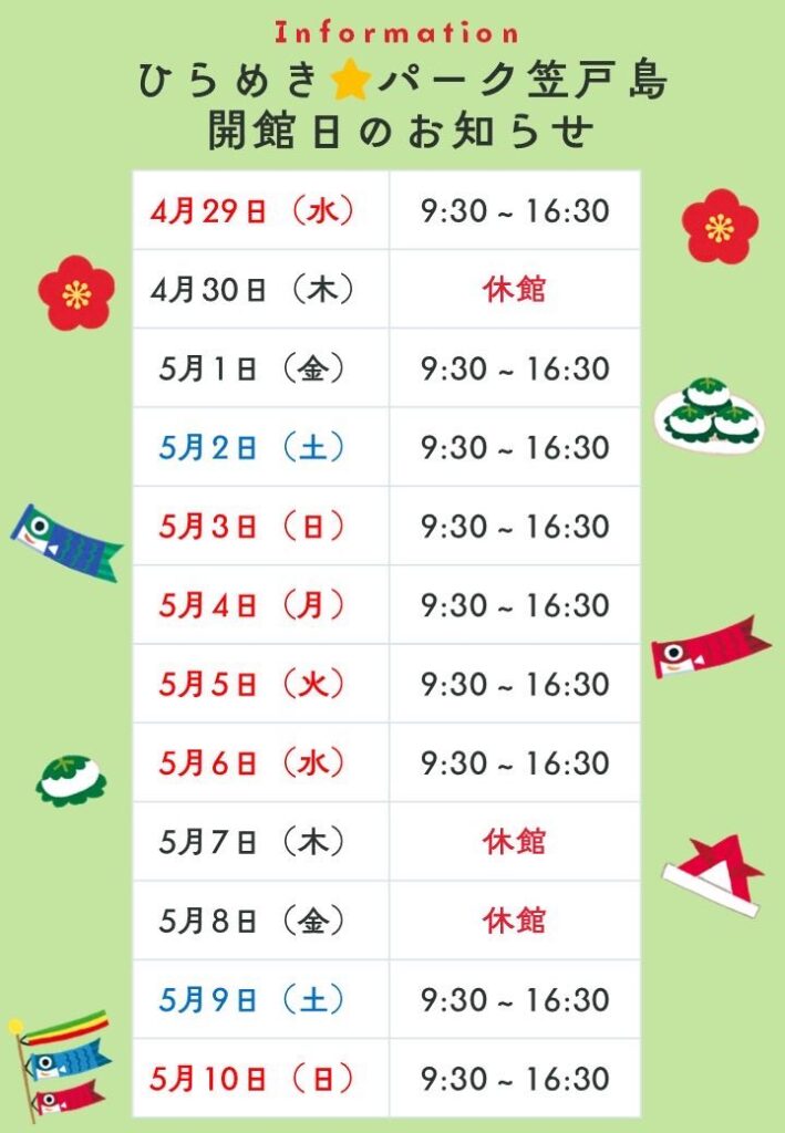 GW営業スケジュールのお知らせ 投稿日 2026.04.24 09:34 ゴールデンウイーク期間中、「ひらめきパーク笠戸島」および「下松市観光案内所」の営業日が通常と異なります。ご来場の際は、事前にご確認のうえお越しください。★ひらめきパーク笠戸島★タッチングプールのほか、工作や折り紙、ぬりえなど、館内でも楽しめますよ★下松市観光案内所★帰省のお土産品や、レンタサイクル、アウトドア用品のレンタル、体験プログラムなどぜひご利用下さい!